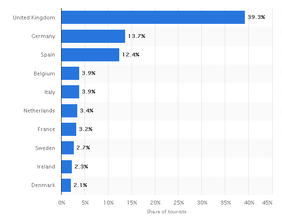 Это статистика туристов на Тенерифе по странам за 2016 г. (в процентном соотношении и сейчас принципиально не изменилась).