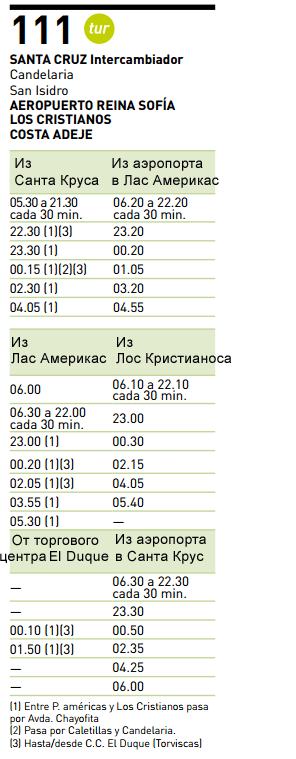 Сергей, подскажите как читать расписание автобусов. Например 111. Надо точно понять все эти столбики. Мне нужно два маршрута по времени. Один - Лос Кристианос до южного аэропорта. Второй - Лос Кристианос - Санта-Круз и обратно.