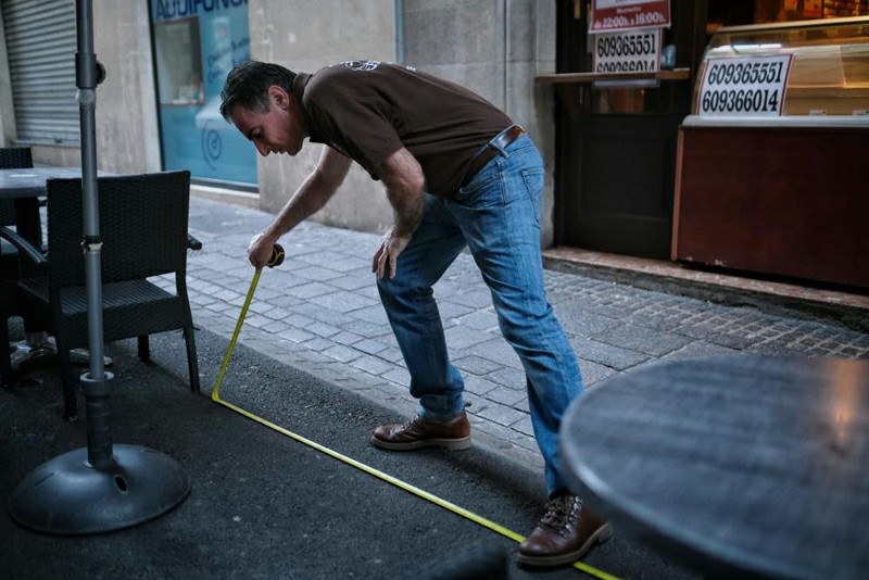 Еще новые реалии жизни: сотрудник ресторана отмеряет минимально допустимое расстояние между столиками.